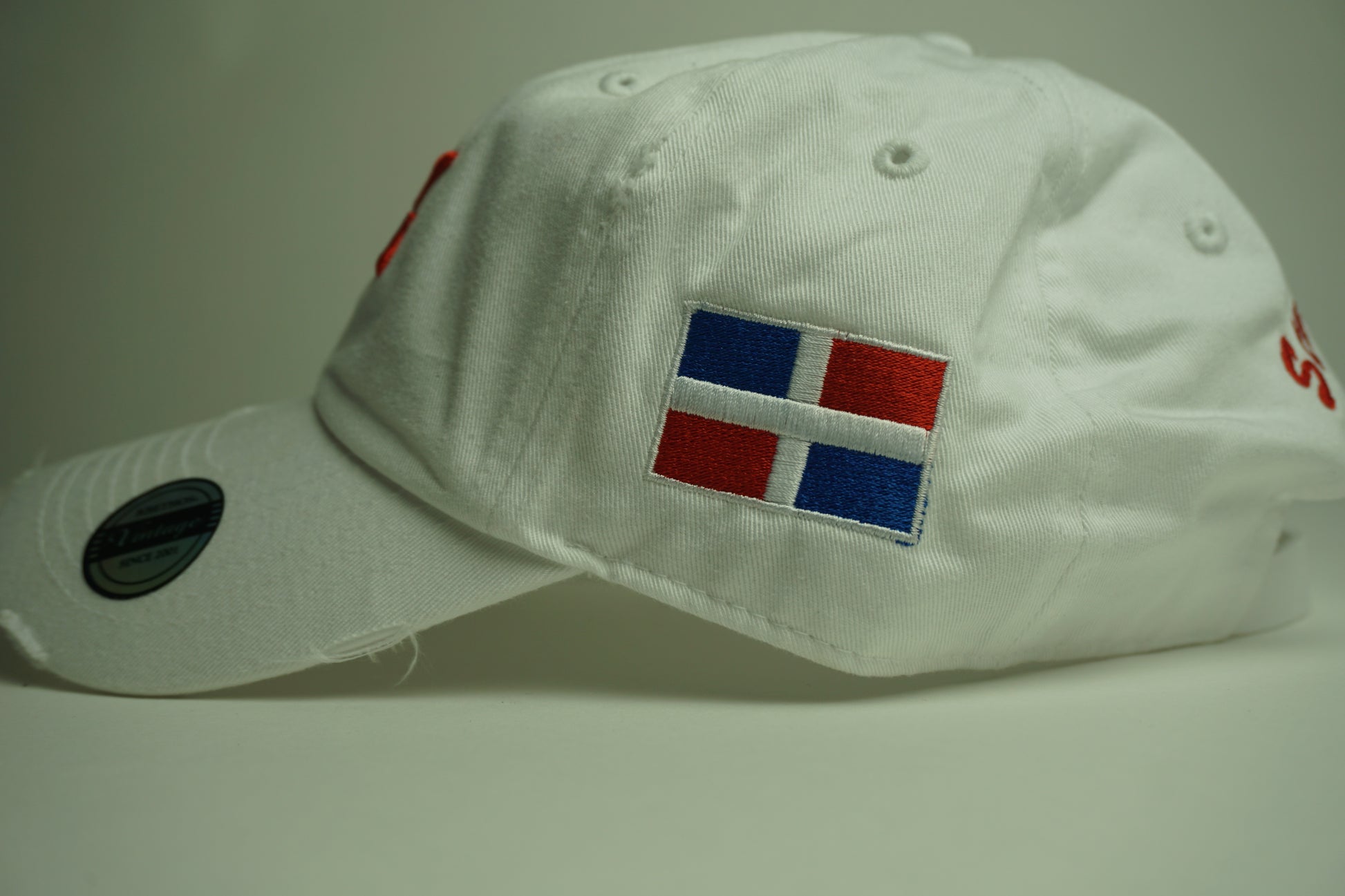4. Brim: The brim is slightly curved, aligning with the classic dad hat style. The distressing on the brim is subtle but adds to the overall vintage appeal. 5. **Interior**: Inside the hat, the seams are reinforced, and a sweatband is included for added comfort and moisture absorption. This combination of high-quality cotton fabric, White color, distressing, and white embroidered logo creates a stylish and comfortable hat that stands out with its unique character and trendy look.