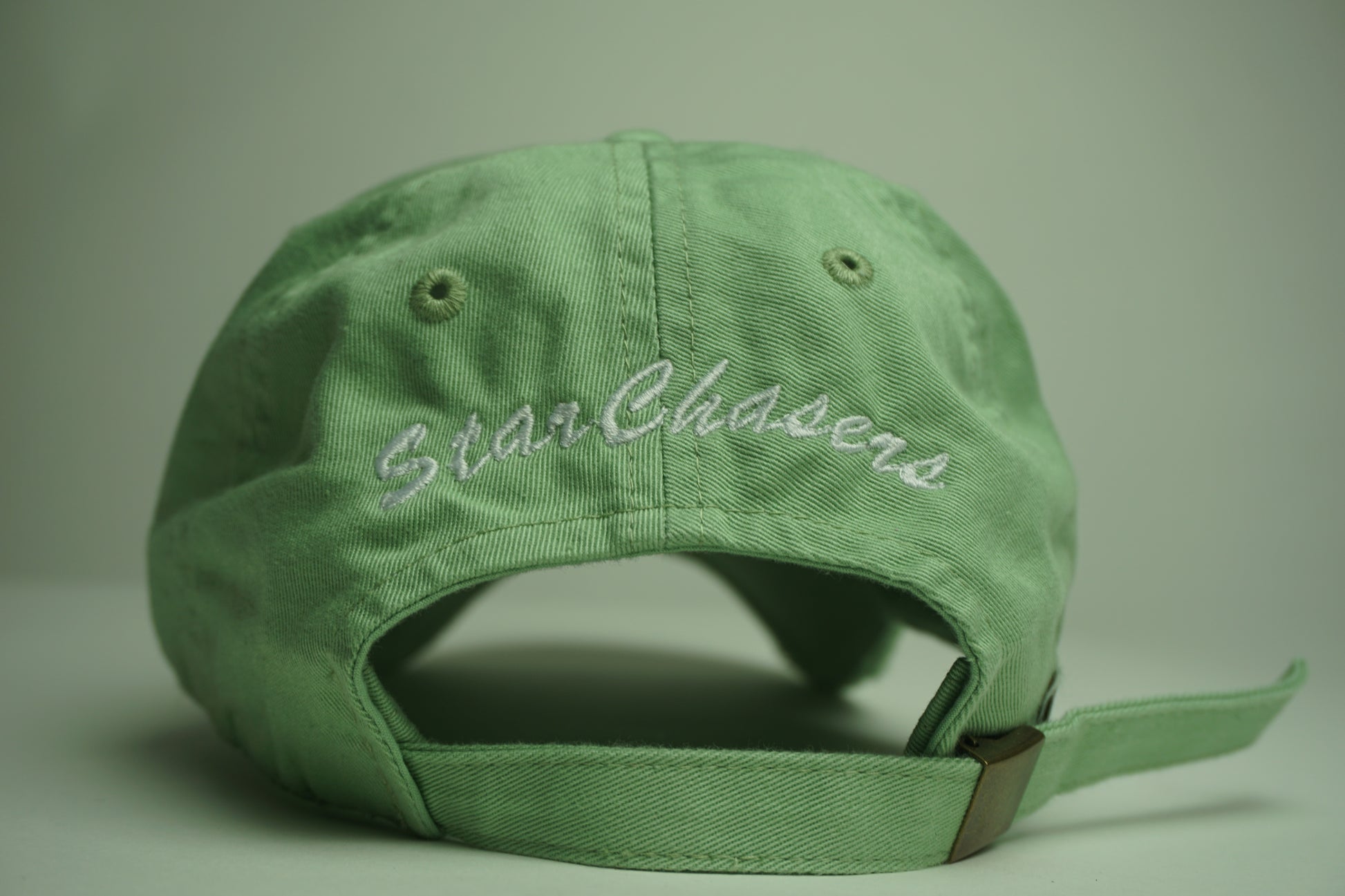 1. **Embroidery**: The "Starchasers" logo is embroidered in crisp white thread, providing a stark and appealing contrast to the green background. The embroidery is done with high precision, ensuring clean lines and a professional finish.